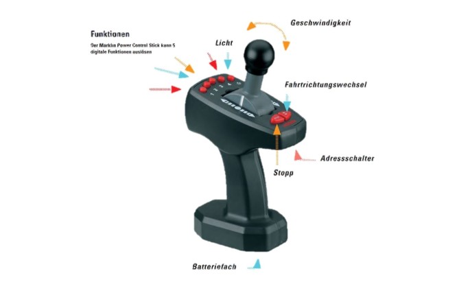 Eine robuste Fernsteuerung wie ein Joystick, ganz ohne Kabel: Der Märklin Power Control Stick liegt optimal in der Hand. Wie schnell es vor- oder rückwärts geht, bestimmt man mit dem Hebel – exakt wie im Vorbild. Ob Geschwindigkeit, Fahrtrichtung, Licht oder Sounds – das alles kontrolliert man mit dem Power Control Stick. Die Steuerung von bis zu vier Zügen ist mit dem Stick möglich. So bleibt immer alles übersichtlich, auch wenn mal mehr los ist.